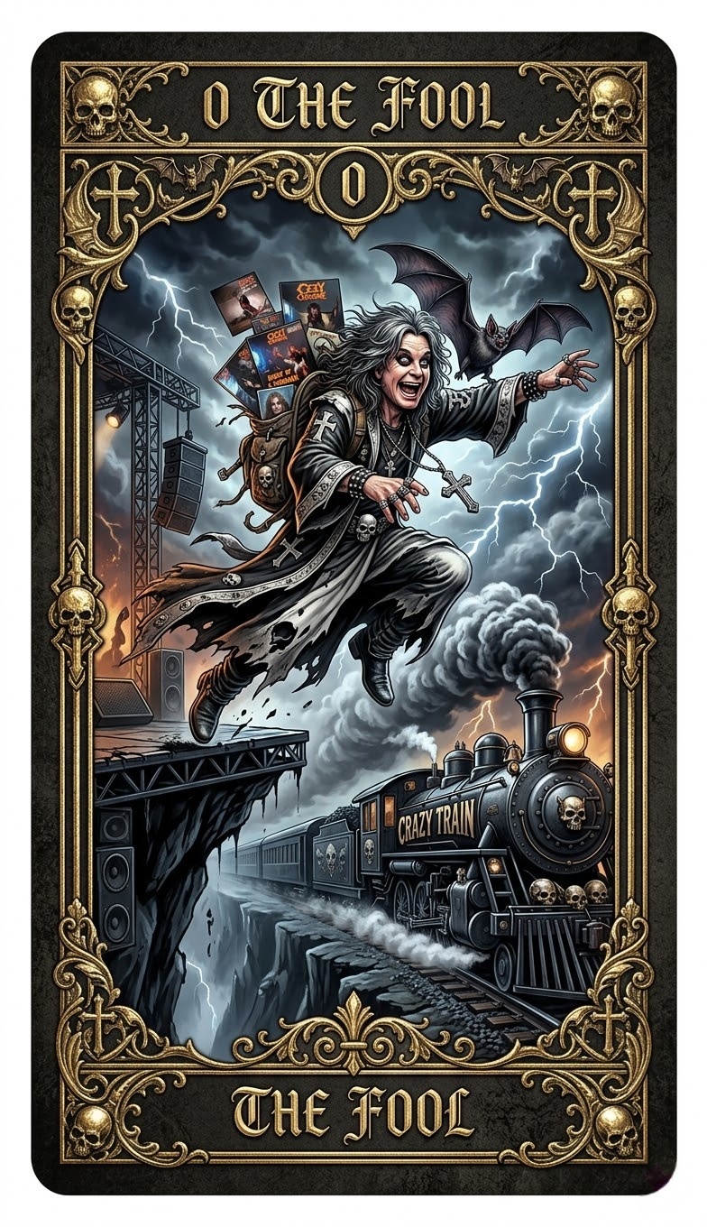 🦇🃏Step into the shadowy realm of heavy metal mysticism with the epic Ozzy Osbourne Tarot Deck – Prince of Darkness Edition, a 78-card masterpiece that fuses the dark fantasy of classic tarot with the thunderous legacy of the Godfather of Heavy Metal himself!